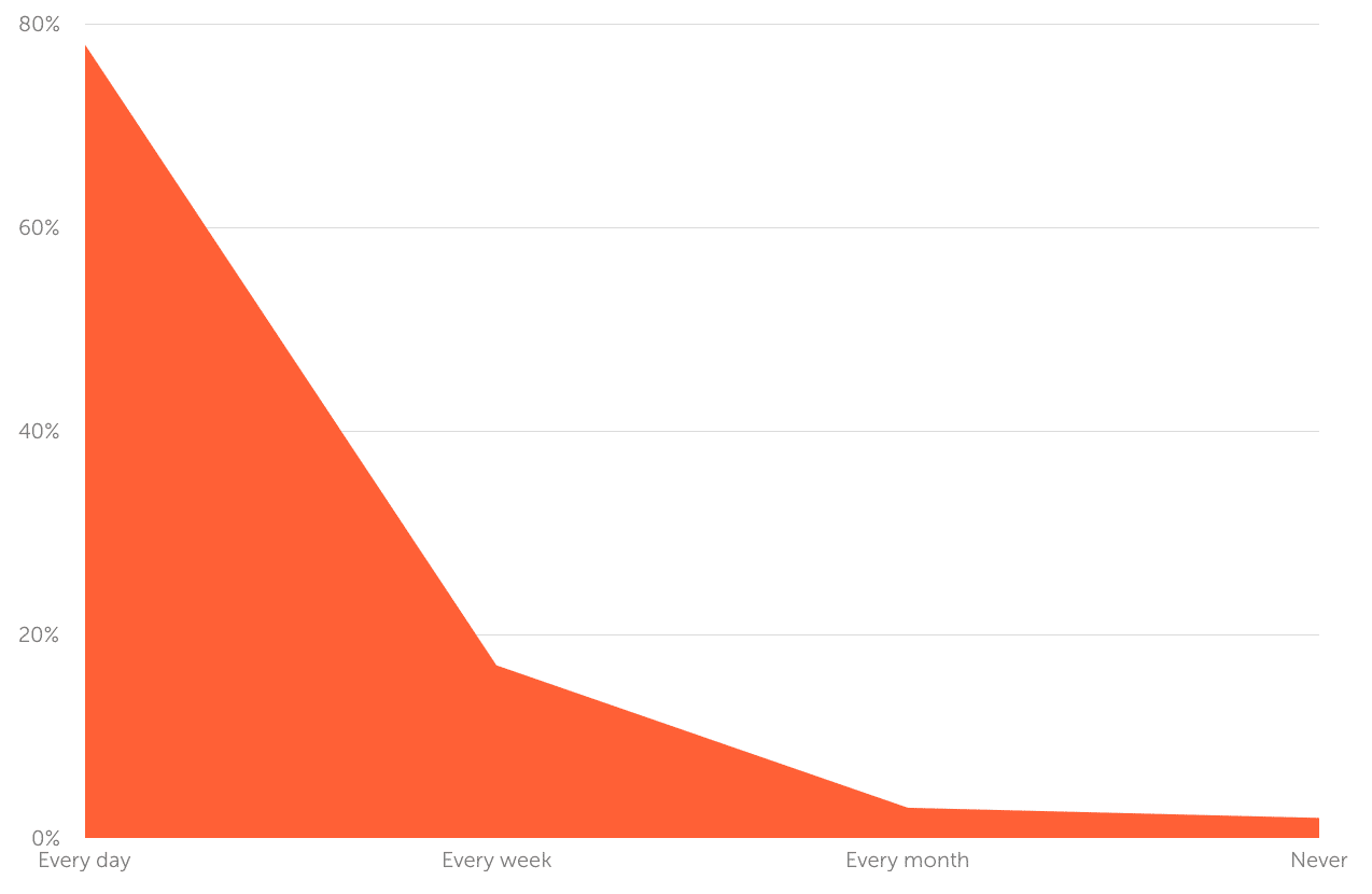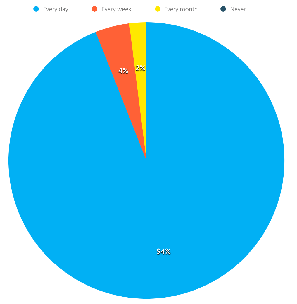 94% of users surveyed log in to Salesforce every day showing how important Salesforce is to their workflow and productivity. Only 4% said every week, 2% every month and 0% never log in to Salesforce.